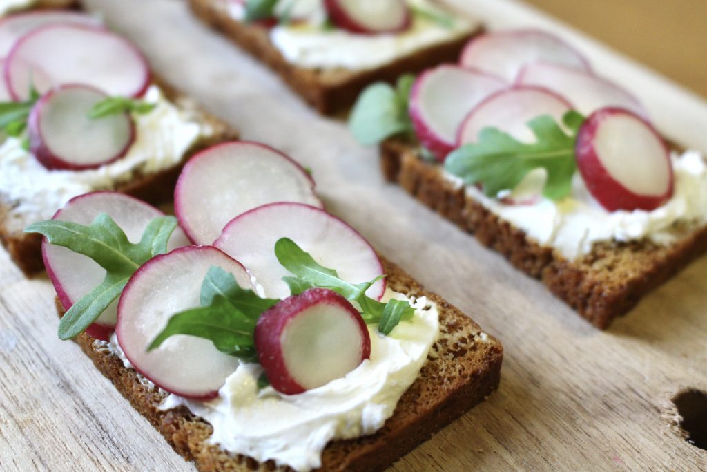 Toast de pain d’épices graines & son de moutarde, fromage frais et pickles de radis